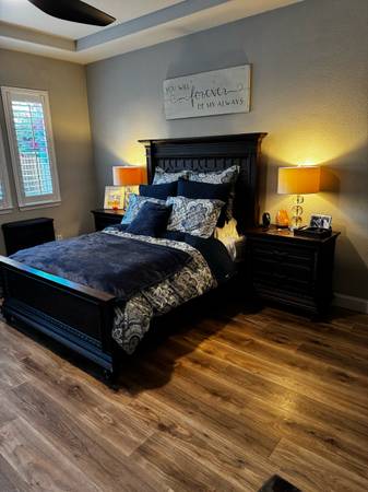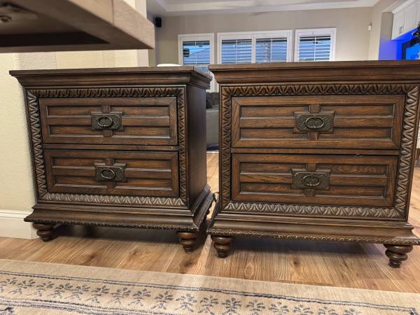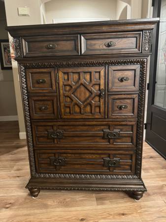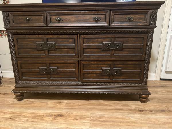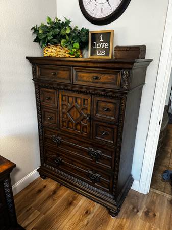 Beautiful 5 piece bedroom furniture. It comes with a gorgeous headboard and footboard, 2 nightstands, a tall dresser and long dresser. It’s well made and heavy. The drawers are deep with cedar lining on some drawers.