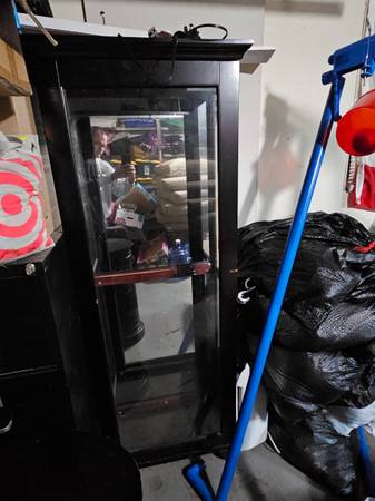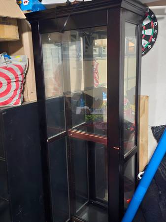 We have an all glass cabinet sitting in our garage that was my late great grandmother's. It has a built in light on top that works, just needs bulb. It has 4 solid glass shelves. Great condition....