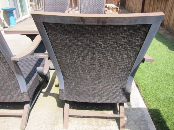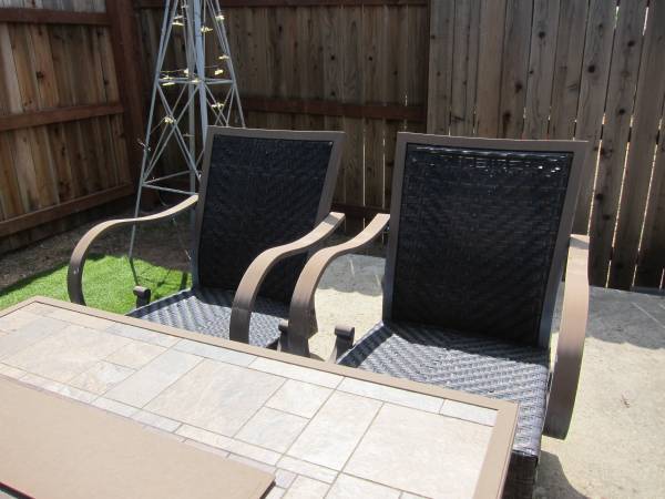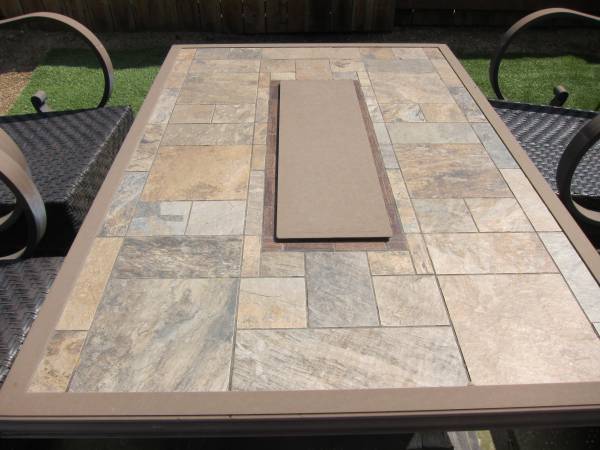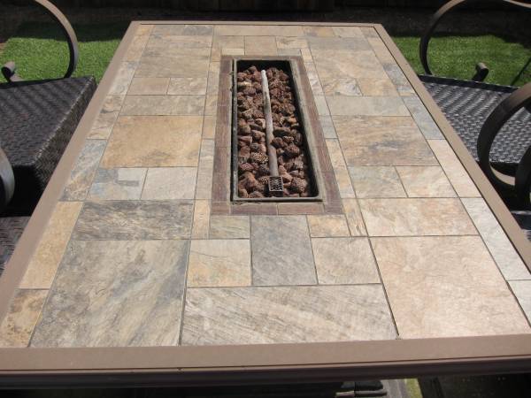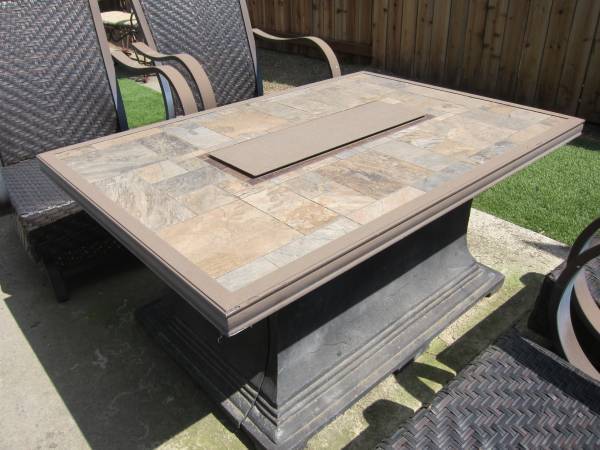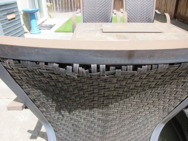 This is for a fire patio set. I’m not sure what model it is. There is a fire table that stores the propane tank inside and has a cover on the top of the table when not in use. It has four rocking chairs w/cushions. The cushions are Sunbrella and could use a wash job. They unzip and can be thrown in the washer. The table has a tile top. One of the chairs has some damage (shown in picture). The measurements for the table are as follows: 50” Wide X 34 ½” Deep X 23 ½” Tall. The measurements for the chairs are as follows: 28 ½” Wide X 24” Deep X 36 ½” Tall (back of chair). I’m asking $500.00 for the set, or best reasonable offer.