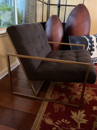 Still available. Mid century modern chair. Navy upholstery and gold metal frame. Heavy, solid and sturdy. It’s not a flimsy chair. No stains or tears. Smoke free and pet free household. Overall...