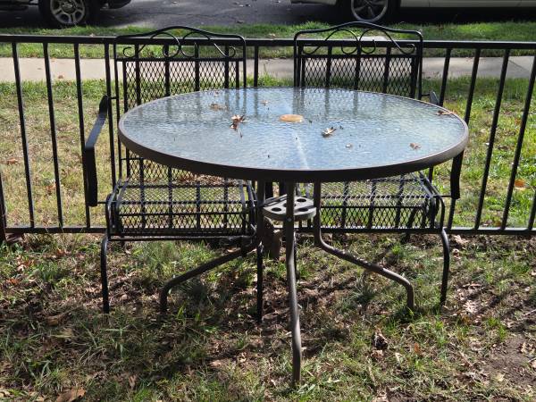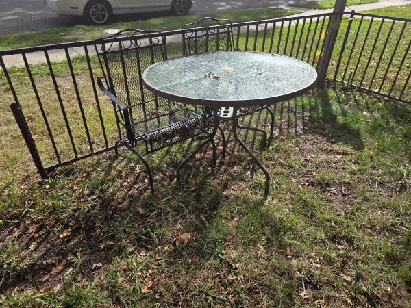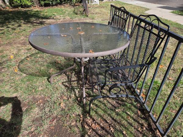 Small Wrought Iron / Glass Table and 4 Chairs w/ Cushions - Patio Furniture Chairs (22 inches) are rockers Table (diameter = 42" / height = 28")
