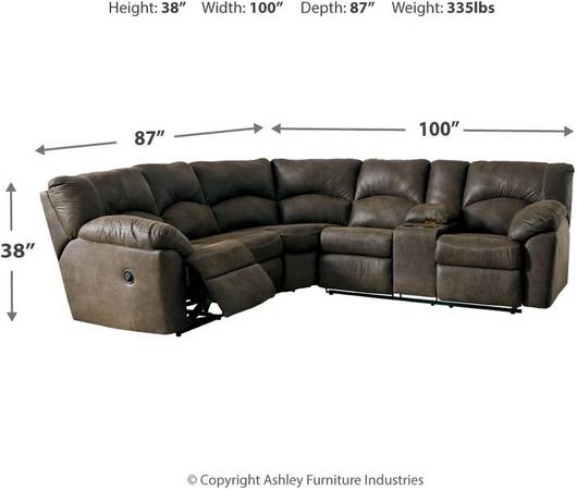 2-Piece Brown Faux Leather Sectional Recliner Pre-owned Excellent condition Pillow-top arms Dual-sided recliners Pull tab reclining motion Dimension: 100"W x 87"D x 38"H Weight: 335 lbs Pick up