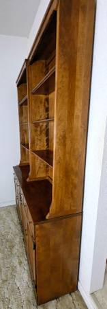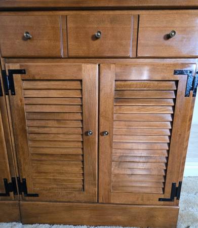For sale is a beautiful vintage Ethan Allen Heirloom Custom Room Plan solid maple storage cabinet with a matching bookshelf hutch in the Nutmeg (Finish 211). This is model 10-4090, known for its timeless Colonial / Early American design and exceptional craftsmanship.