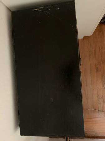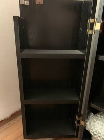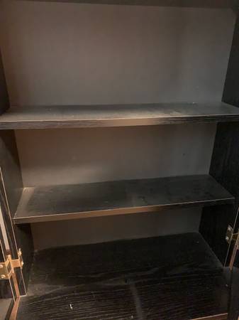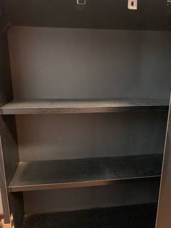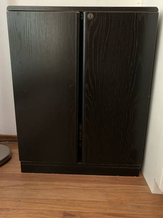 Black cabinet that have a key lock for extra security. Added storage shelves on the side panels