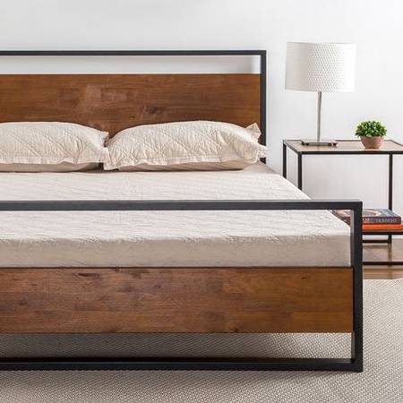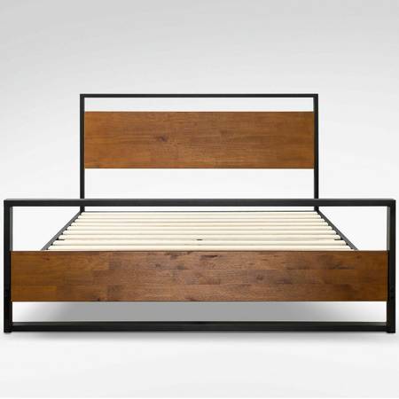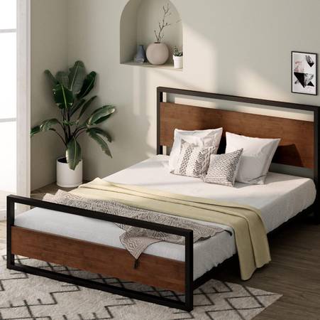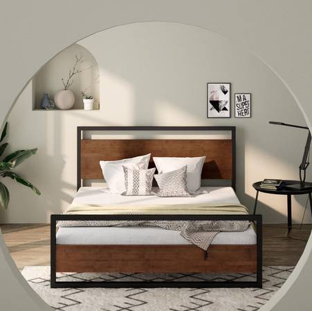 Brand New Modern Metal and Solid Wood Platform Bed Frame with Headboard and Footboard - Queen Size