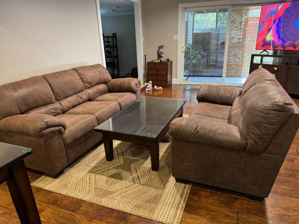 Brown Sofa and Loveseat Like new condition Coffee brown Leather look Microfiber Pillow arms Attached back Replacement cushion Firm seat cushions Sofa: 90"W x 36"D x 38"H Loveseat: 70"W x 36"D x 38"H...