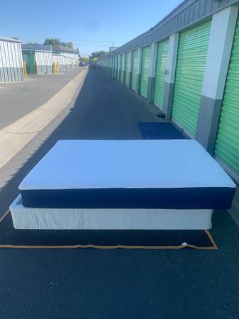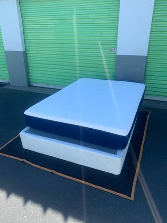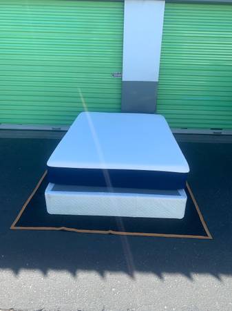 Excellent condition FULL size bed and metal frame. One sided 10 inch CASPER coil/foam mattress with zip on washable cover. SUPER CLEAN and FRESH!!! Atop a white gray box foundation , plus metal hollywood bed frame. $140. Delivery available for either for fee depending on location.