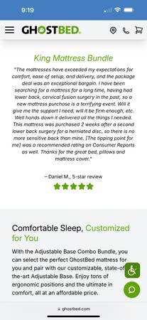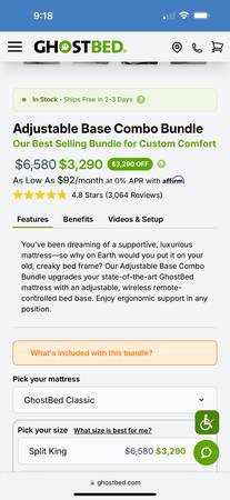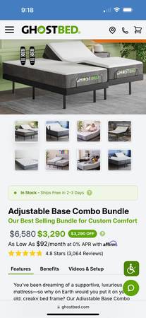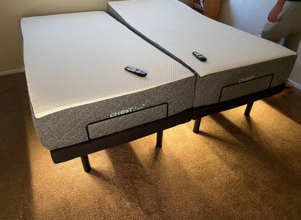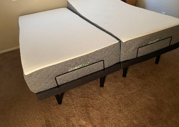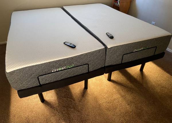 Ghost Bed 11” Split King Memory Foam Mattresses with adjustable bases ! The bases have many different options including zero gravity and massage. This set has massage and two wireless remotes. The mattresses are a split king and each side can go up and down individually. Each side can lift up to 750 pounds per side. It is a king size bed which measures 76 inches wide, 80 inches long and the mattresses are 11 inches thick. Also known as an eastern king, euro king or regular king. It can be used as two twin XL beds. It can be used in different rooms. It has removable washable covers. This bed has great reviews. Retails for $3,233 plus tax. I am only asking $1,700 and I will deliver it for free. I will even set them up if needed. I can also remove your old bed for free up to 100 miles if needed. 916 five eight five 0407