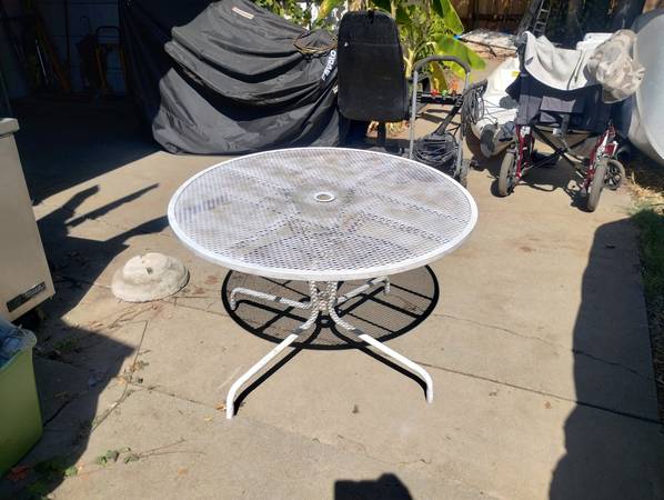 This round metal Patio table has a hole for a umbrella and a concrete base too for $25.00. Cash only, no trades. Call and talk do not text or email Andrew from 9-9 at .