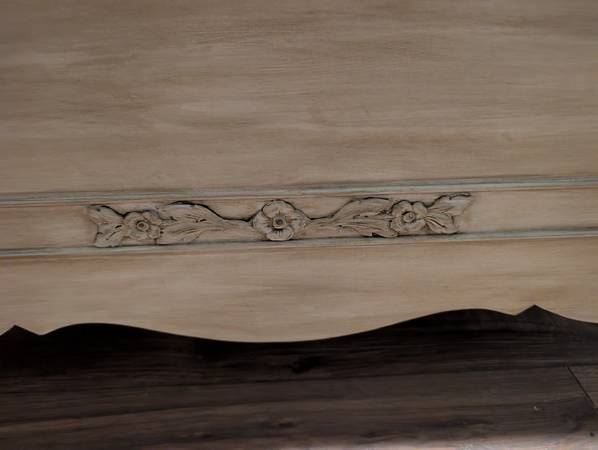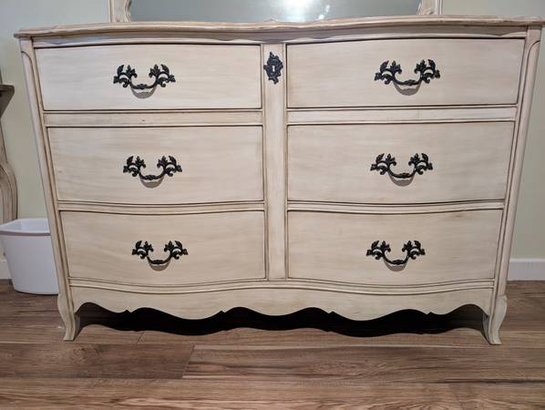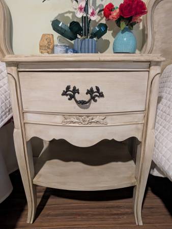This charming, 1950's bedroom set is American made and any little girl's dream. It has adorable flower details, and solid brass handles. It was refinished for my daughter, but she has outgrown it. This vintage French Provincial bedroom set is solid wood and ready for a new home. Everything is in fabulous working condition, very heavy and solid.
