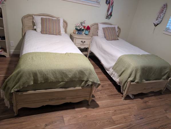 This set comes with 2 matching twin beds with head boards and foot boards, dresser, mirror, lamp table, book shelf and vanity/desk.
