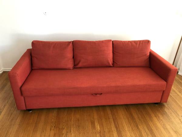 Sleeper sectional,3 seat w/storage, red orange IKEA Friheten sofa that becomes a sleeper. About a full/Queen size when opened up. It’s in great condition. No rips no tears on the sofa no smells no smoke, no stains.