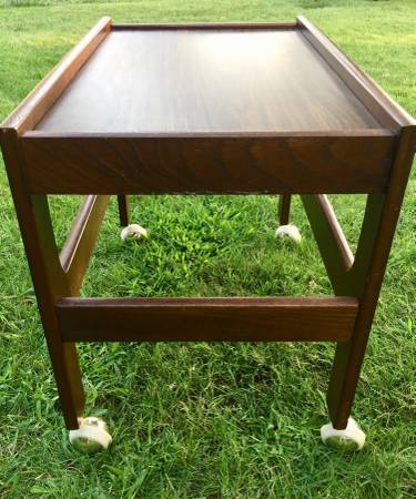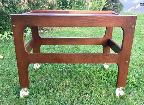 Multipurpose Rolling Cart in great condition. High quality build and craftsmanship with real wood framing and composite tabletop with gorgeous finish. Beautiful gold Sheperd Circa accent casters. Can be used for your retro CRT television for retro gaming, Tea, Bar, Table, Drink Cart, or just display the cart itself. Mid Century Modern design. This is a harder to find cart due to its compact design, which makes it easy to maneuver and will fit in smaller settings. Serious inquires.