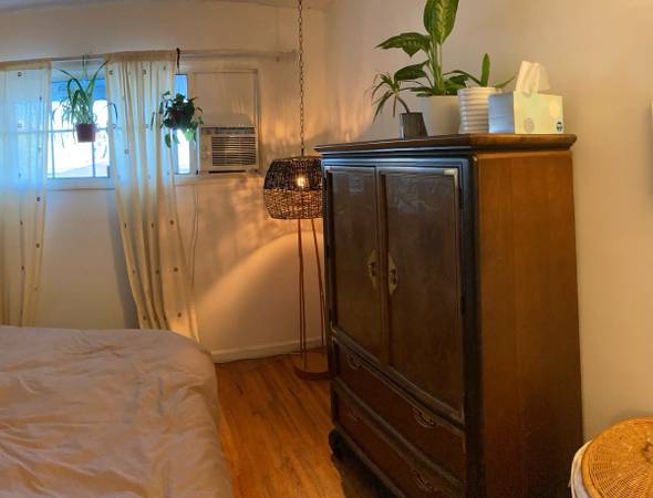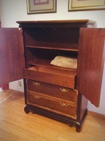 Four-piece solid wood bedroom set— includes two nightstands, an armoire-style wardrobe/ dresser, and a queen-sized headboard. (We used the headboard with a full, which also worked.) The furniture is sturdy and heavy!