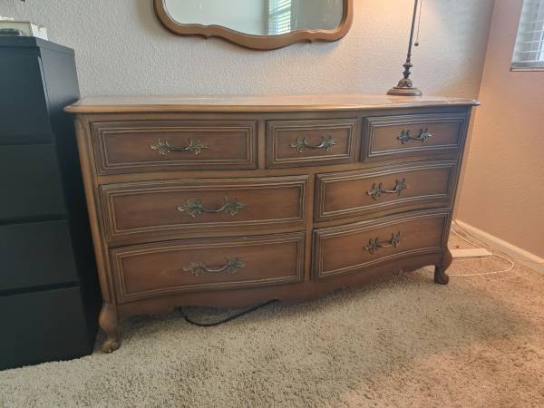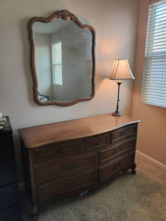 A gorgeous bedroom set made up of a classic dresser and mirror. These are beautifully constructed with solid wood.