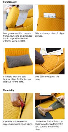 Designed by Patricia Urquiola, Hosu is a convertible lounge chair that invites you to spread out. When it’s time to get things done, Hosu features cable pass-through at the base to allow laptops, tablets and mobile devices to easily connect, plus rear and side storage pockets.