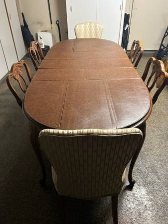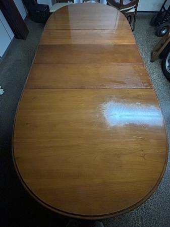 Beautiful polished finish solid wood formal dining table, six padded chairs (2 head, 4 side), 3 leaves, leather/felt protective table top pads. Mid-century style table in good condition.