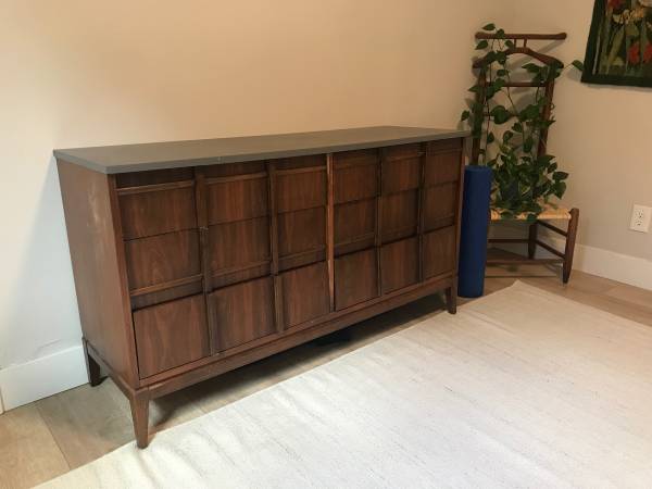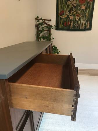 Beautiful vintage mid century modern dresser! The top is painted a really nice velvety gray and the rest is solid wood. The drawers open really smoothly and can be taken out easily (would recommend taking them out for transport to make it lighter).
