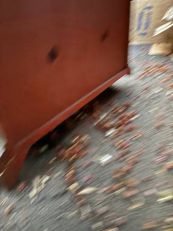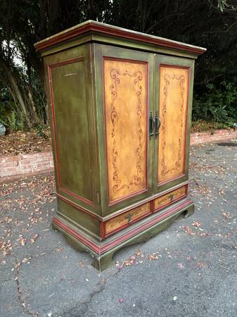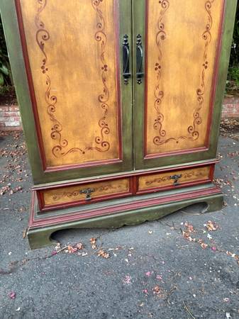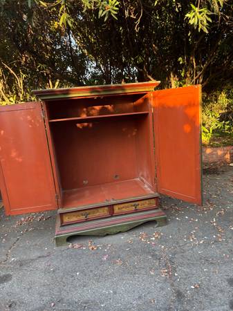 One upper shelf inside. Two pull out bottom drawers. Various molding detail in contrasting colors. Nice vintage hardware, rustic red earthen clay color inside