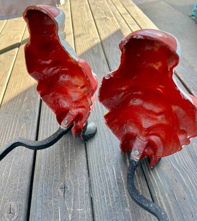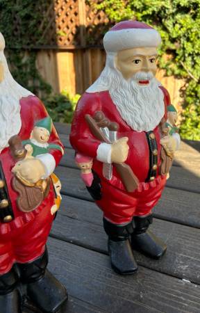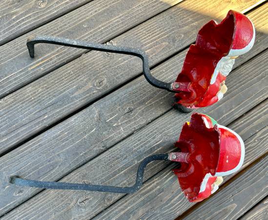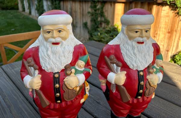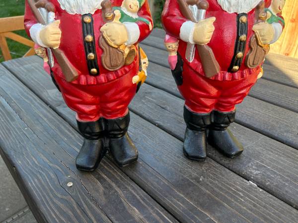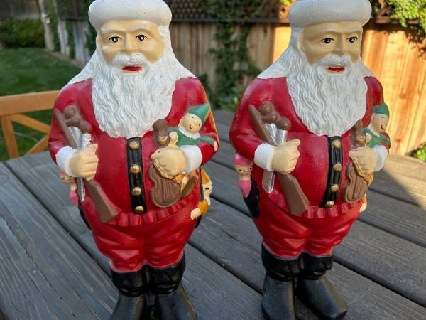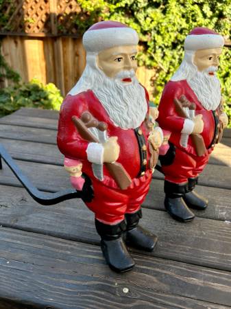 VINTAGE 1970s 14" IRON PAINTED CHRISTMAS SANTA CLAUS ST NICK DECORATION FIREPLACE ANDIRONS. In beautiful condition $250