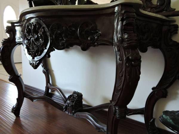 Hand Carved White Marble Top Console Table with Mirror. Great Condition Victorian Style Exact Age and Origin Unknown. Carved Gilt French Style Carbriole Legs Dimension : 92"H x 56"W x 22"D Weight:...
