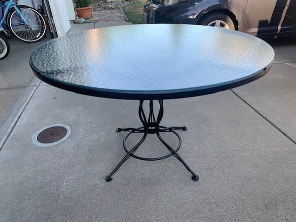Vintage Woodard wrought iron patio set with table and 4 chairs with floral design 48" Round patio table glass top Great condition Price firm