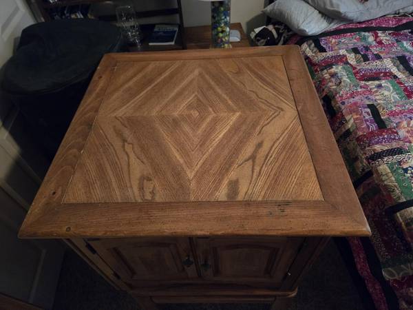 Beautiful oak end table. 27" x 27" x 21" high. $49 or best offer. Call Alan .
