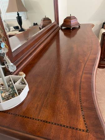 Large dresser & nightstand. Dresser has 9 drawers, the top 3 are lined w/brown felt. The other 6 are wood bottoms. Original owner. In good shape. Dimensions: dresser 68 x 39, 20 1/2 wide;...
