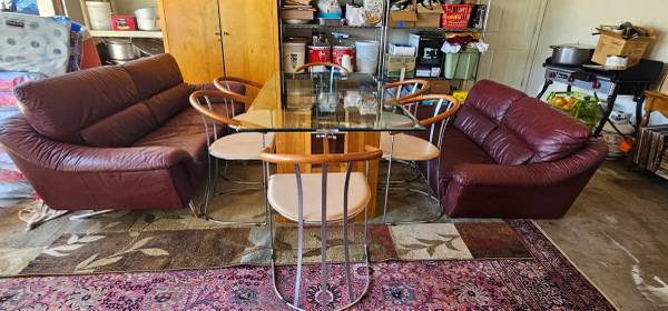 The table 3x6ft and has a chip on one of the sides. The couches are a little creased but clean and the color is vibrant. One of the couches is missing its legs. Any item can be bought individually...