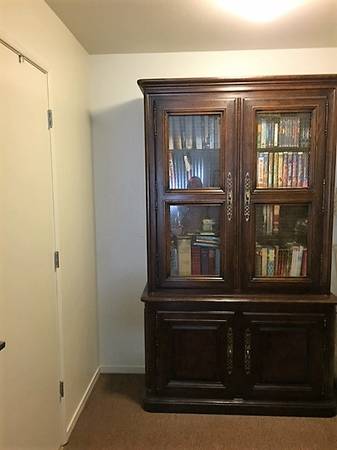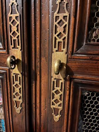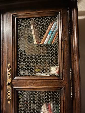 Henredon a high end furniture company, vintage armoire. Classic chicken wire and glass doors. Top also has heavy glass shelves for great storage of books, glassware, collectibles etc. Bottom of cab has 2 doors which open to more shelving and drawers. We've used armoire in living room, dining room, family room and even kitchen area. Not a tv armoire. Great in contempo and traditional decor Downsized, no room for it.
