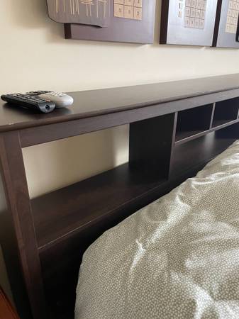 King size headboard with shelving. Like-New condition. NOT attached to any bed frame. HEADBOARD ONLY $150