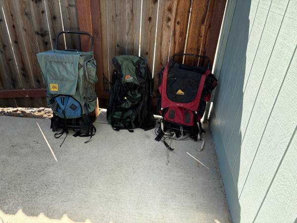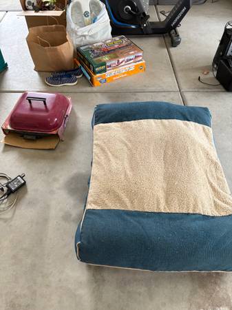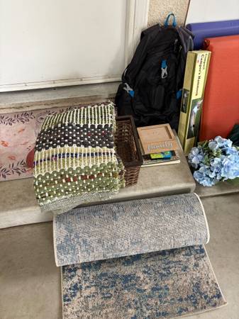 Camping/backpacking equipment, speakers, 24” monitor, games, inflatable swimming pool, fake grass, 10 ft runner, (2) dog beds - great shape, also dog backpacks, foot massager, videos, kids games,...