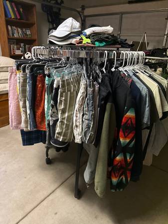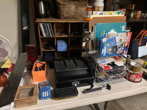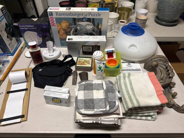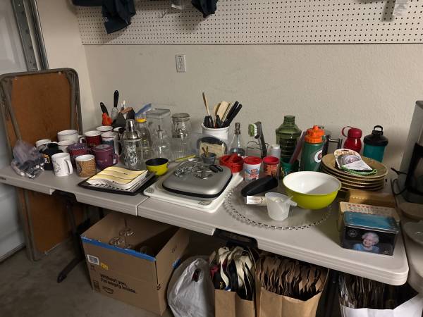 Garage Sale - actually INSIDE the garage! Lots of great items including a bookcase, books, 3 burner camp stove in rolling bag, camping dishes, tea kettle, coffee pot, Kate Spade purse, 3 sets of CA King sheets, 2 CA King/King bedspread sets with Euro Shams and pillows, kitchen and homegoods, men’s and women’s clothing, Dyson vacuum, sports storage rack, Bombay Company side table, Weber tabletop grill, and much more.