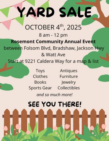 Rosemont - Between Bradshaw, Jackson Hwy, Watt and Folsom is having it's Annual Yard Sale Over 50 locations Come to 9221 Caldera Way for map and list 8 am to noon Bring you puppy Lutheran Church is...