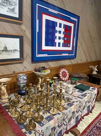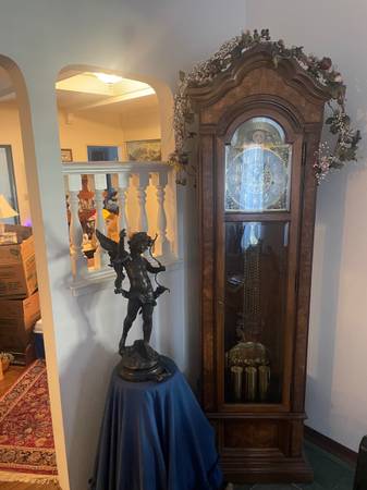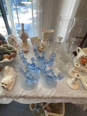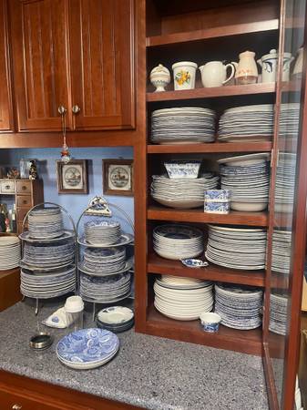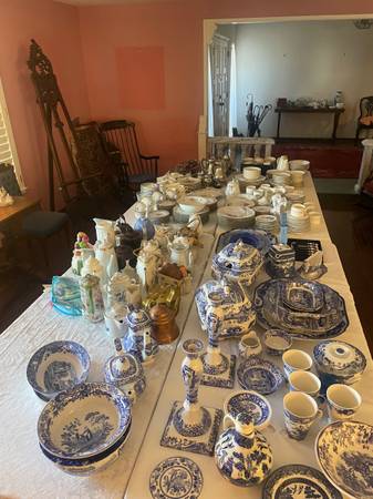 Huge collection of Blue/White Spode, beautiful antiques, Crystal, antique furniture, stemware, hen on a nest collection, grandfather Clock, pool table, piano, Christmas, decor, barbecue, yard art, vintage clothing such as Pendleton/gunne sak, sterling silver, leather couches, book collection, vintage stereo equipment, treadmill, exercise bike, weight, bench, moon and stars collection and so much more!
