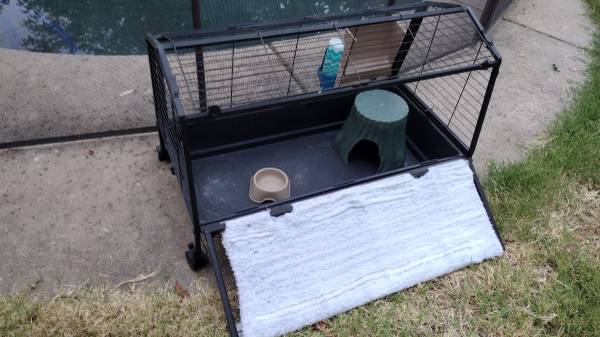 Nice metal cage w wheels,opened top and door, removable tray for easy cleaning
