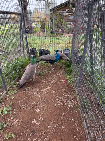 Peacocks 2 males, 2yo and 1yo 2 females, 1yo $125 each Older Adult male shown in photo not for sale.