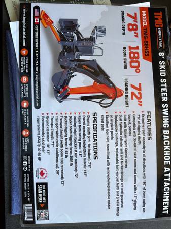 TMG 8' Skid Steer Swing Backhoe Attachment, Model SBH55, $4750, New Unused,