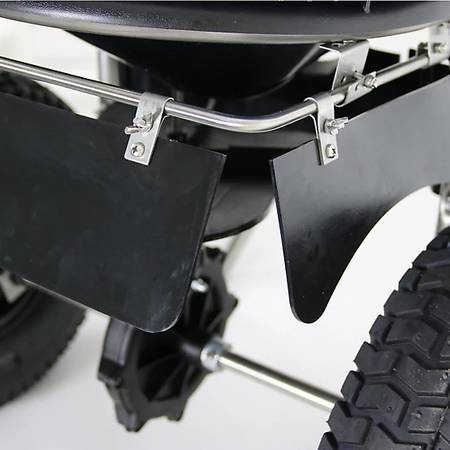 This heavy-duty salt spreader has wide 14-inch pneumatic wheels ideal to use on bumpy surfaces because it protects the load from the impact.