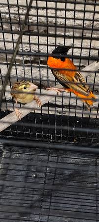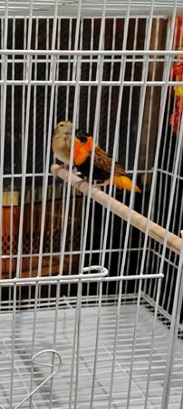 Hello 2 pairs of Orange Crowned Weave finch. Each pair with cage $120 text for more info 916904242seven Keywords: birds bird finches finch cage nest