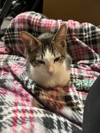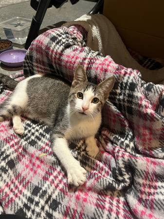 We found a male kitten, not chipped (6-7mo old) and have had him for a week and a half. He had a vet visit and physical exam is healthy. He is not neutered but is such a sweet cuddly boy. He uses litter box great, eats hard and wet food, loves to play/toys. He comes with food, bed and some toys. Please help us find him a loving home as we have 3 cats of our own and can not keep him.
