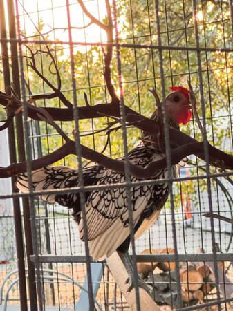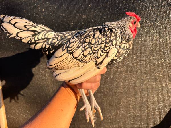 Selling our 3-1/2 month old gorgeous Seabright lace rooster. Very sweet and protective handsome bird. Keywords: Chicken, bantam , silkie mini chickens