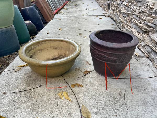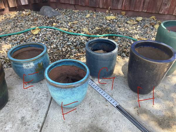 Assortment of garden pots Measurements are height x width at top Priced Individually OR purchase all for $380 A. 13.5 x 12 .5 $35 B. 15 x 11.5 $35 C. 16 x 11.5 $35 D. 13.75 x 12.5 $25 E. 11.75 x...