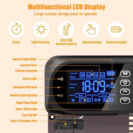 Automatic Chicken Coop Door Solar Powered, LCD Screen Electric Auto Chicken Coop Door with Timer & Light Sensor, Aluminum Rechargeable Automatic Chicken Door Opener with Remote Control & 4 Modes