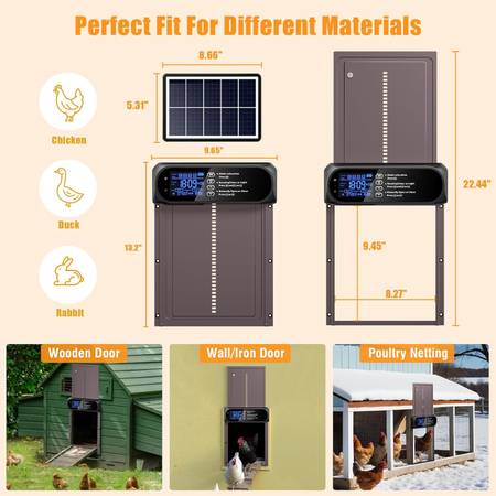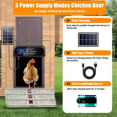 Aluminum, Anti-Pinch Function: keep your chickens safe all the time, Outdoor Indoor automatic chicken coop door with 3 power supply modes: Solar Powered + USB Type-C Charging + Bult-in 4000mAh Battery, Timer & Light Sensor to free you from early-morning and late-night routines