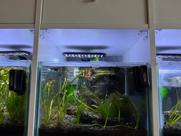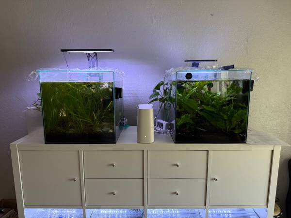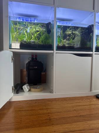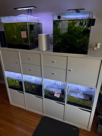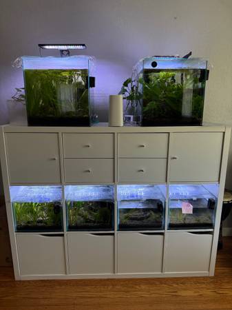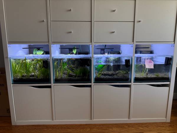 4 x custom handmade frameless 5.5gal aquariums that fit IKEA Kallax shelves (1/4 inch thickness glass, Momentive RTV100 Silicone), with custom hinged lids and leveling mats