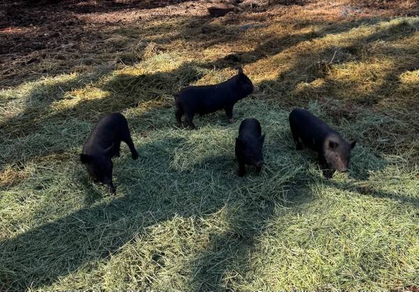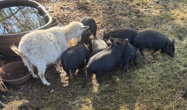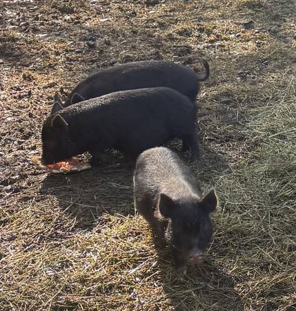 These piglets were born in late July about 25 pounds. Their sow is a cross of who knows if I was to guess maybe Agh and kune kune and the boar is a 250lb American Guinea hog. They produce rich dark meat, a docile homesteading pig eat grass acorns and roots. Great companion animals as not aggressive ours pasture with our goats. This litter has nine and they are ready to find their next pasture.