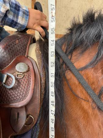 She measures 54 inches tall at the whither. Dam is a 12.3 hand bay quarter pony, father is a grey 15.2 hand Andalusian.