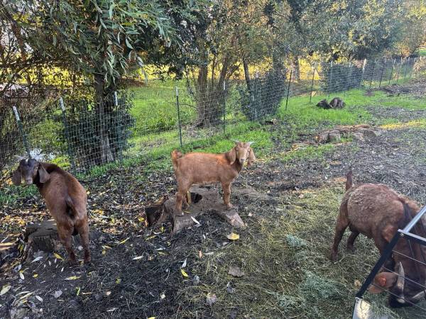 Boer goat buckling boys intact looking for their new brood! 9 month old boys all self weaned on alfalfa and now with grain. Dapple sire, dams on site. Healthy and friendly, socialized with dogs, kids, chickens and geese; raised on organic orchard. Non-vax, nor dewormant, naturally raised in organic pear orchard.