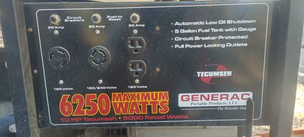 Generac Generator -6,250 Maximum Watts -5,000 Running Watts -10 HP Tecumseh Gas Motor Starts, Runs & Powers $500 Call or Text: